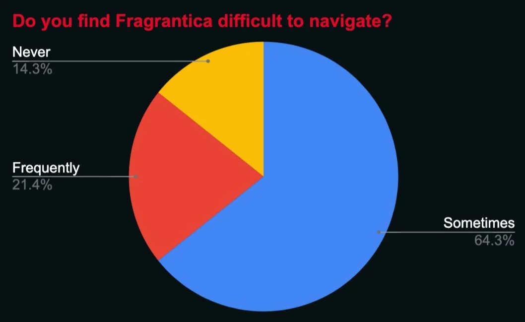 The pie chart above reflects the answers of the same surveyed users. Most of these users (93%) attested to using Fragrantica multiple times a week, and yet 64.3% of those users find Fragrantica is at least sometimes difficult to navigate, while a little over 20% find it frequently difficult to navigate. If these answers reflect the experience of dedicated Fragrantica visitors, it is easy to imagine that new visitors to the site would find it less than easy to navigate.
